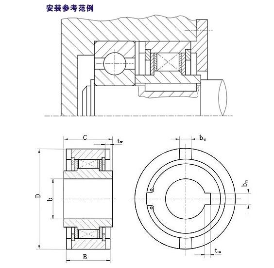 標準安裝方式為已型號與軸承同軸并排,相同的公差要求。內環與軸用鍵聯結,外環尺寸公差為 h7與公差為H7的機壁配合,外環兩側端面鍵用于固定外環與機壁以傳遞扭矩。