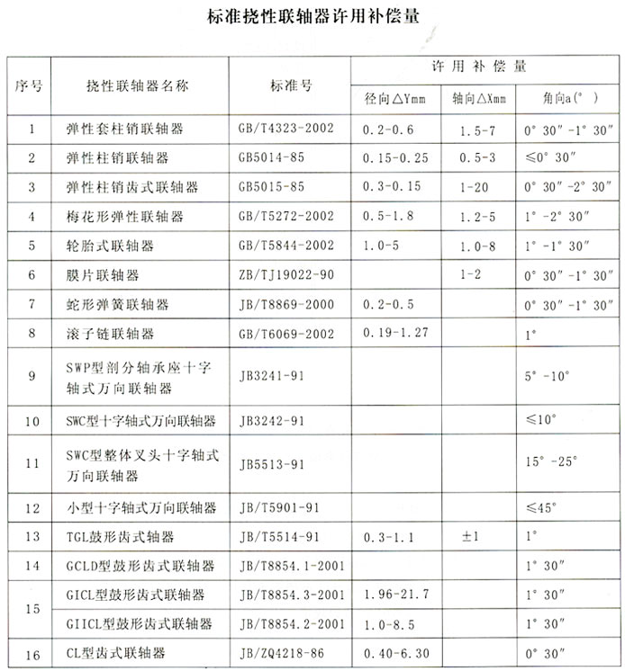 撓性聯軸器一般都具有不同程度的軸向、徑向、角向許用補償量。是指由于聯軸器的制造誤差、安裝誤差、工作時載荷變化所引起的沖擊、振動、機座下沉、溫度變化以及軸承磨損等綜合多種因素所形成的兩軸線相對偏移量的補償能力,而不是允許的安裝誤差,安裝誤差應小于所規定的許用補償量。 |