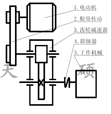 減速器是原動機(jī)和工作機(jī)之間的獨立的閉式傳動裝置,用來降低轉(zhuǎn)速和增大轉(zhuǎn)矩,以滿 足工作需要。圖3-1是減速裝置的傳動簡圖。圖中電動機(jī)1經(jīng)膠帶傳動2帶動齒輪減速器3 的輸入軸,齒輪減速器輸出軸端裝有聯(lián)軸器4,通過聯(lián)軸器帶動工作機(jī)械5。目前減速器的 主要參數(shù)如中心距、傳動比、模數(shù)、齒寬系數(shù)等都已標(biāo)準(zhǔn)化。