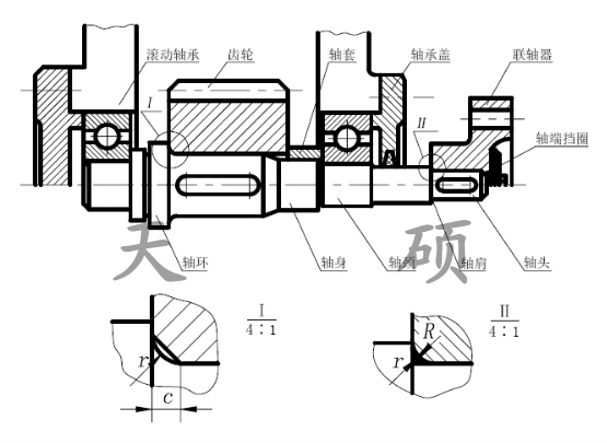 常用的軸上零件的軸向固定方法是利用軸肩和軸環(huán)結(jié)構(gòu)。圖中的齒輪和聯(lián)軸器就是分別 靠軸環(huán)和軸肩作軸向固定的。為了保證軸上零件能靠緊定位面,軸肩和軸環(huán)的圓角半徑r 應(yīng)小于軸上零件孔的倒角高度 C 或圓角半徑 R 。