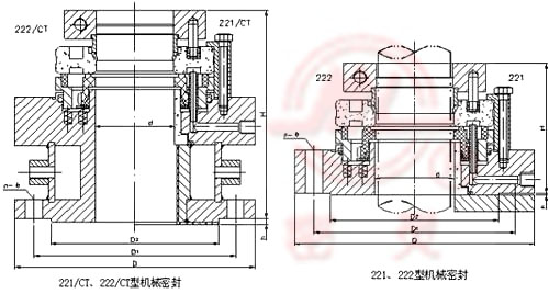 221型 221、222型機械密封是一種徑向雙端面釜用機械密封,它特別適應軸向尺寸受限的工作場合,221型是承受強腐蝕性介質(zhì),可用在搪玻璃反應釜等上;222型適應弱腐蝕性介質(zhì),常與不銹鋼等釜配套使用。 >>適用范圍:壓力(絕壓)1.33×10-5~1.0MPa,密封腔溫度≤80℃,轉(zhuǎn)速≤500r/min 。 >>221/CT、222/CT為在原型的基礎上下加調(diào)溫器,適用于-40~250℃的溫度范圍,高度增加100mm左右,其余尺寸不變。