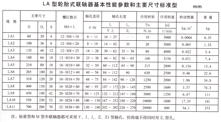LLA型輪胎式聯(lián)軸器基本性能參數(shù)和主要尺寸