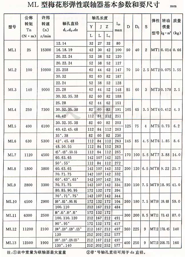 ML系列梅花形彈性聯軸器基本性能參數和主要尺寸