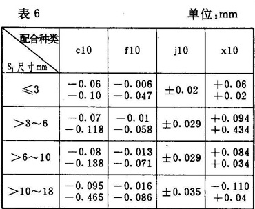 表4和表5中的d7,f6,R7,H7和H9可從國標GB1801-79查得,而上式中Sjclo,Sjf10,SjJ10和Sjx10的上差和下差的含義是以基圓弧齒厚Sj之值作為公稱尺寸,查JISB0401標準中的C10,f10,j10或X10的上差和下差。常用公差值也可從表6中查得。δM1B和δM2B的數值可從表1中查出,K1和K2的數值可從表2中查得。
