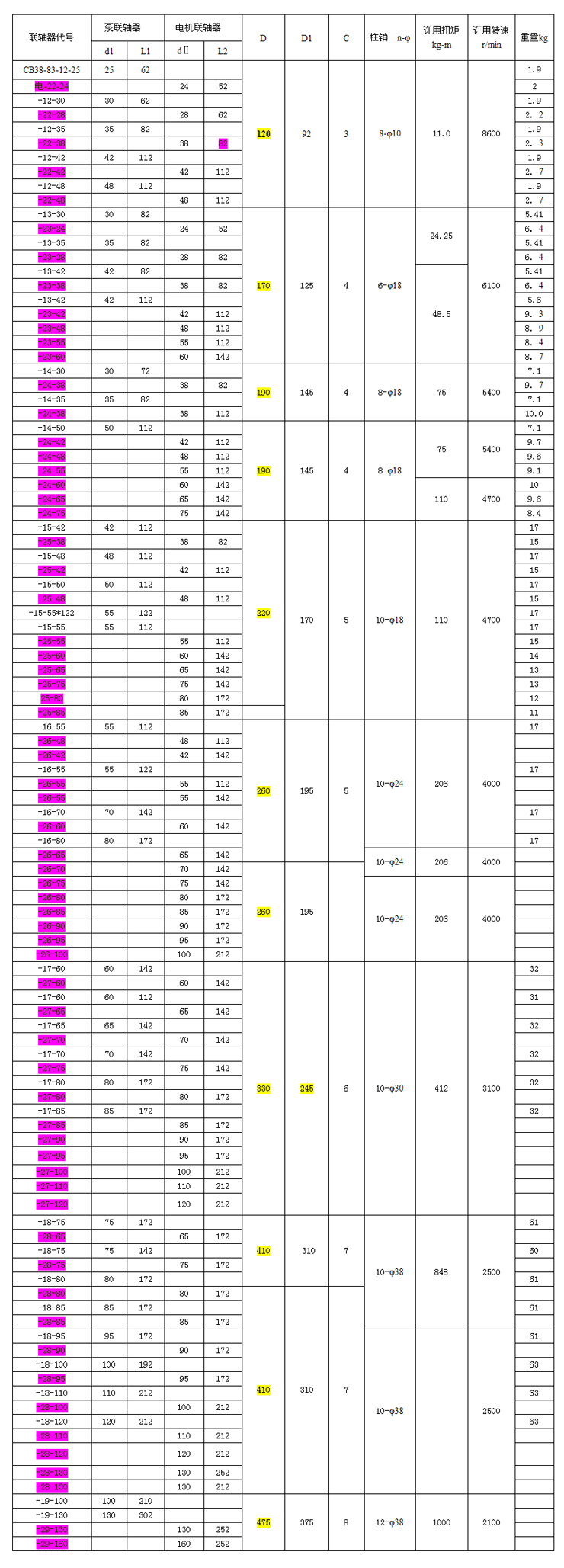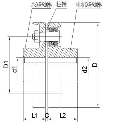 ①彈性套柱銷聯軸器的柱銷上套有橡膠圈,具有彈性和補償軸線位移的能力,但相對角位移較大時,易磨損; ②結構簡單,安裝方便,更換容易,尺寸小,質量輕,傳動轉矩大,廣泛應用于各種旋轉泵中; ③許用相對徑向位移0.14-0.2mm;許用相對角位移0度40分; ④兩軸軸線相對位移產生的附加徑向載荷為(0.1-0.3)P; ⑤水泵行業的標準為Bll01,其最大許用轉矩為8316N·m,最大軸徑為200mm.