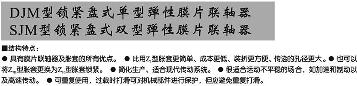 滄州天碩聯軸器有限公司生產以下系列彈性膜片聯軸器:JM型彈性膜片聯軸器(JB/T9147-1999)、JMJ型雙型彈性膜片聯軸器、DJM型脹套聯結單型彈性膜片聯軸器、DJM型鍵聯結單型彈性膜片聯軸器、 SJM型鍵聯結雙型彈性膜片聯軸器等類型。聯結軸套形式有以下幾種:SJM帶鍵槽型軸套、帶脹套型軸套、帶Z3型脹套軸套、帶錐套型軸套、鎖緊盤式單(雙)型軸套、JNC系列高速膜片聯軸器等。如需其他聯結形式,請來電來函咨詢。滄州天碩聯軸器有限公司生產的膜片聯軸器以優異的產品質量、快捷的交貨期加上售前售后優良的服務態度,成為諸多機家的首要選擇。