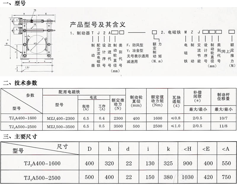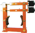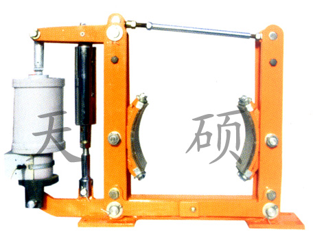 制動器的驅動裝置——電磁推動器通電前,制動器在漸加器內主彈簧作用下,處于制動狀態(常閉態)。通電后,推動器推桿上移,通過角形杠桿板(6)使漸加器閥桿上移,制動臂張開,在退距同步裝置作用下,制動瓦等距離脫離制動輪,制動器處于釋放狀態。斷電后,在漸加器作用下,制動器進入初制動階段,制動力矩由小至大逐漸增加,實現平穩工作制動的目的;逐漸地,制動力矩增大至額定制動力矩及以上時,制動器進入終制動階段,實現安全防風制動的目的,整個制動時間為4-8秒。用戶可根據自己的作業特點任選。 本產品在使用過程中只需調整推動器的補償行程就可以,其它無需調整。避免了在現場使用過程中隨意性和調整制動器的盲目性。