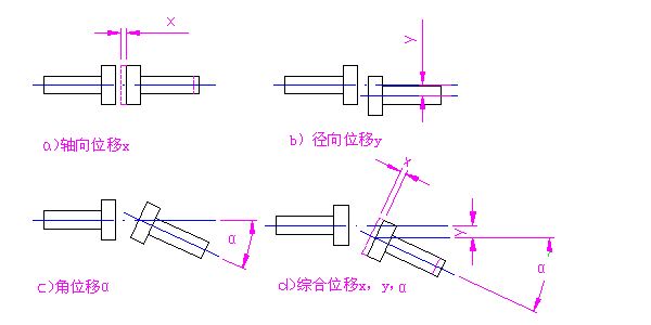 聯(lián)軸器所聯(lián)接的兩軸,由于制造及安裝誤差,承載后的變形以及溫度變化的影響等,往往不能保證嚴(yán)格的對(duì)中,而是存在著某種程度的相對(duì)位移,如下圖<聯(lián)軸器所聯(lián)兩軸的相對(duì)位移>所示。這就要求設(shè)計(jì)聯(lián)軸器時(shí),要從結(jié)構(gòu)上采取各種不同的措施,使之具有適應(yīng)--定范圍的相對(duì)位移的性能。