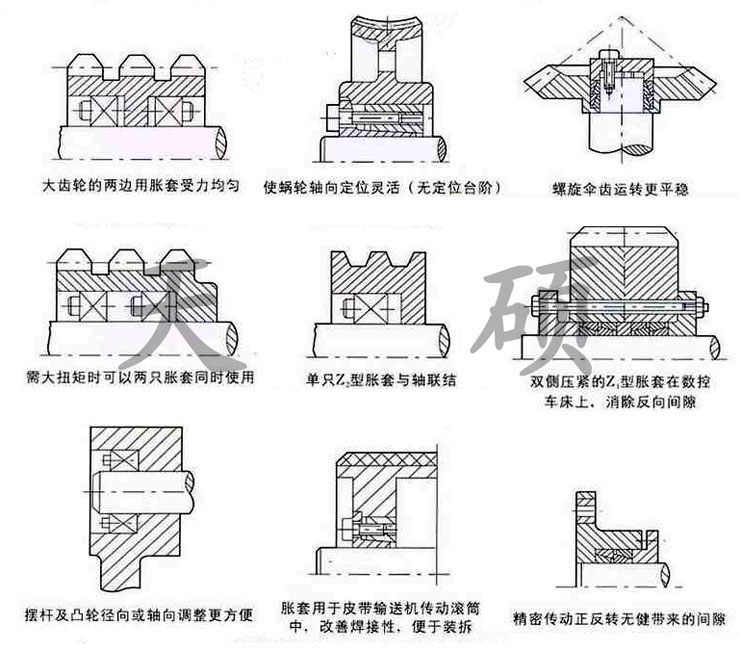 脹緊聯結套廣泛用于各種機械傳動聯結(也稱無鍵聯結),代替了傳統的鍵聯結。應用于:包裝機械,紡織機械,礦山機械,冶金機械,印刷機械,煙草機械,鍛造機械,各類機床和互換機械傳動聯結。例如:皮帶輪,鏈輪,齒輪,螺旋槳,大型風扇及其他各種聯結等; 特點:扭矩大、精度高、裝拆方便快捷、操作簡單、定位性好、降低被配合軸和轂的報廢率、可重復使用、不損壞配合表面,是目前最理想、最經濟的選擇.